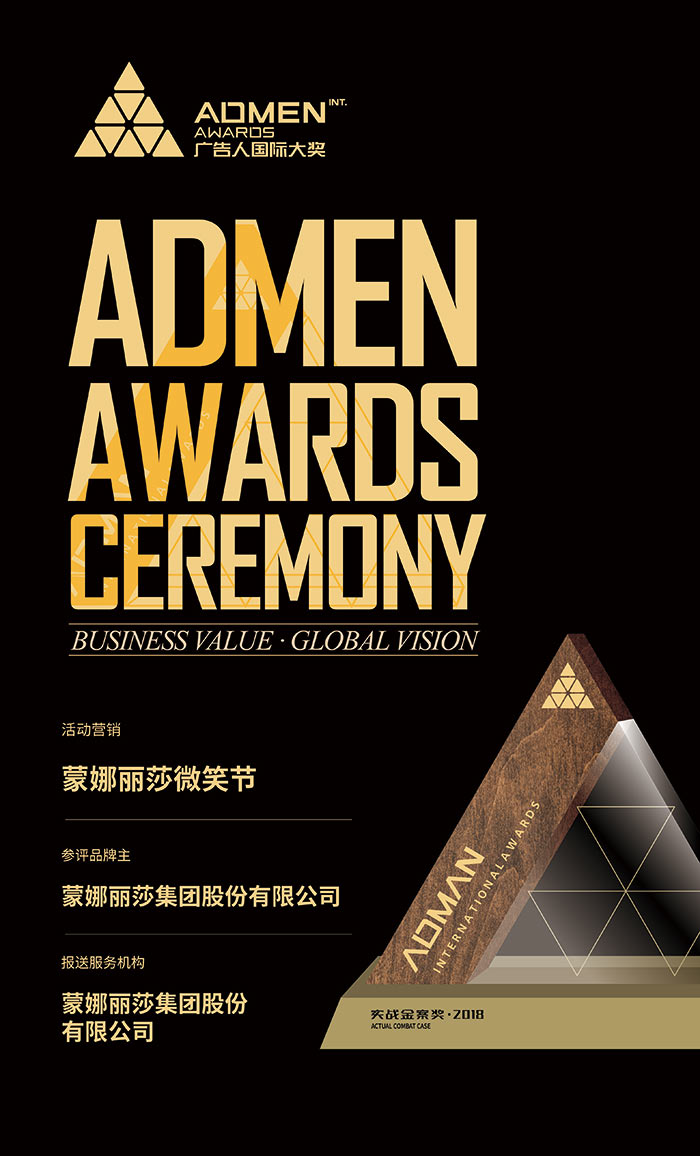 ADMEN国际大奖联合百名广告主组成评审团,对1000多参赛案例进行评审,遴选平均分80以上的质优实战金案,这是一项受广告传媒领域瞩目的行业贡献奖,一直享有“广告界奥斯卡”之称。蒙娜丽莎获此殊荣是对蒙娜丽莎营销创新能力、团队实战能力以及蒙娜丽莎品牌影响力的重要肯定!