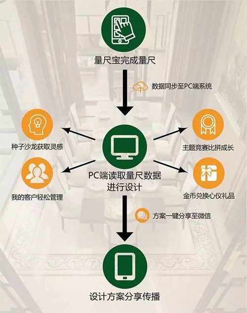 ▲从导购接待客户录入信息到量房沟通、设计出图、效果图分享传播,蒙娜丽莎瓷砖设计云平台实现了整个环节的数据连接。