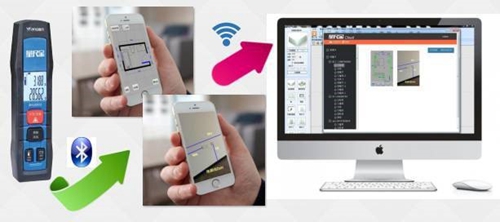 操作步骤:【激光笔+测距仪进行量尺记录】→【通过蓝牙将数据传送至手机APP】→【APP拍照标注、手绘户型图】→【量尺详细数据同PC端】→【设计师直接使用软件进行设计】