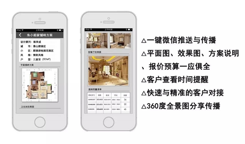 ▲在蒙娜丽莎设计云平台,人们可以一键分享设计方案。当客户点开方案,平面图、效果图、全景图、方案说明、报价预算一应俱全,方便及时查看与反馈。