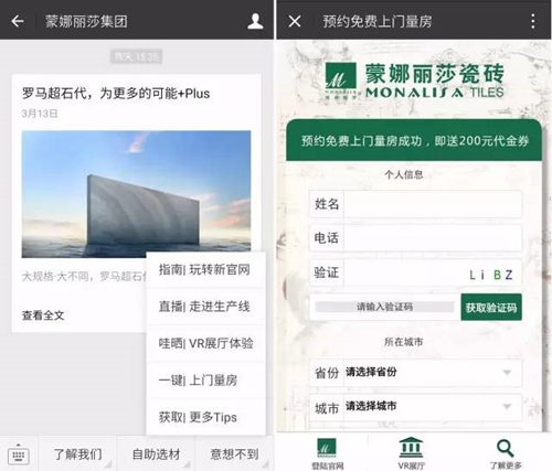 2016年,蒙娜丽莎推出了在线预约平台覆盖终端近2000家门店,通过预约平台进行在线信息登记,系统将会帮顾客选择附近的门店为其服务。