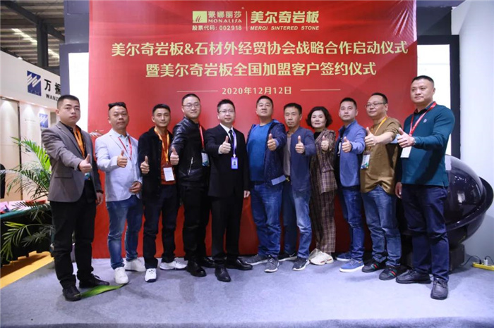 展会开幕当天,蒙娜丽莎-绿屋建科正式启动了美尔奇岩板与石材外经贸协会的战略合作,同时与石空速配网就线上营销新模式的合作进行签约。与此同时,来自全国各地的二十多位石材渠道客户,纷纷与美尔奇岩板签订合作协议。