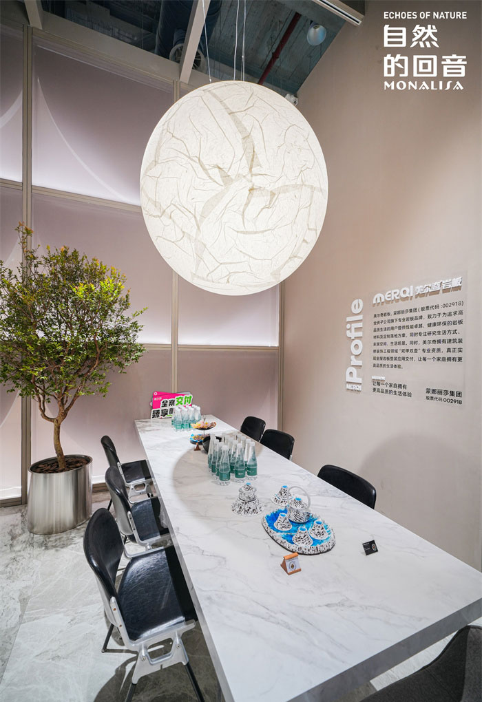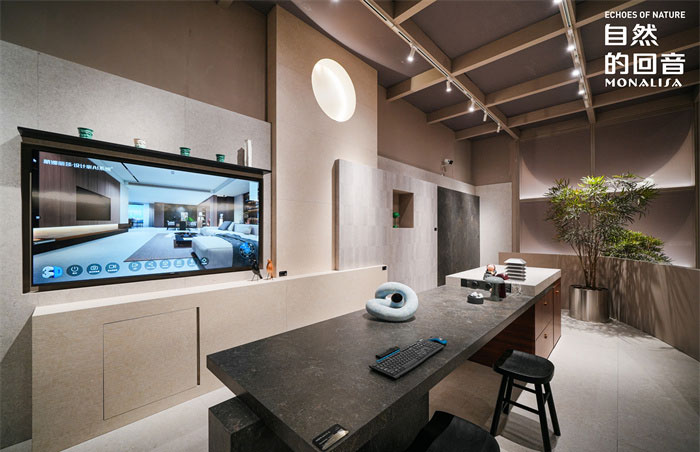 与情绪板展区、蒙娜丽莎大家居瓷艺系列展区、智慧门店系统展区,美尔奇高级定制岩板交付展示空间,为设计师和用户打造更绿色、系统、科学的空间解决方案,从建筑陶瓷厂家进阶为空间整体设计、交付方案的解决者。