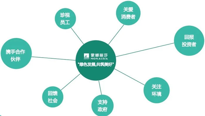 蒙娜丽莎集团根植建筑陶瓷行业,提出“绿色发展,共筑美好”的责任理念,构建起关爱消费者、携手合作伙伴、珍视员工、回报投资者、关注环境、支持政府、回馈社会等多位一体的企业社会责任体系,与股东、客户、环境、员工及社区等利益相关方为实现“人民对美好生活的向往”的事业而共同奋斗。