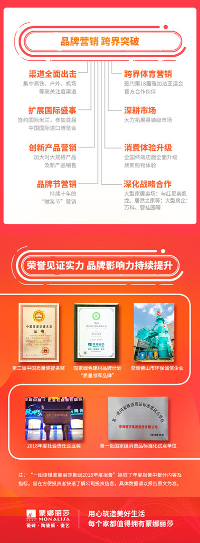 蒙娜丽莎瓷砖品牌隶属蒙娜丽莎集团有限公司,品牌商标注册于2000年,专注于美化建筑和生活空间,产品涵盖陶瓷砖和陶瓷薄板、大板、岩板等品类,秉承“每个家 都值得拥有蒙娜丽莎”的品牌发展理念,将蒙娜丽莎的微笑作为营销服务的核心精神,使顾客在感受艺术化产品的同时,享受高品质的服务所带来的精神回报,满足人们多样的生活方式需求。