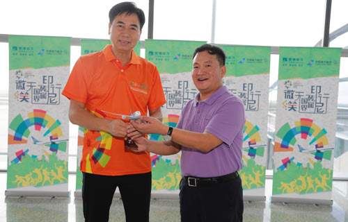 航班出发前,蒙娜丽莎集团联合南方航空举行了简短的送机仪式。乘客们身着醒目亮丽的定制服装,一早便在白云机场集结完毕,随后蒙娜丽莎集团副总裁邓啟棠和南方航空相关负责人互换了纪念品,航班正式起飞前往雅加达。