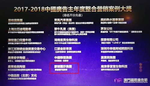 本届广告节对为实业、传媒业、互联网业、广告界等作出重大贡献的行业精英、营销案例、传播机构、广告公司、制作公司及大家最喜爱的品牌进行表彰。其中,蒙娜丽莎集团凭借“蒙娜丽莎微笑节”品牌活动,获颁“2017-2018中国广告主年度整合营销案例大奖”,得到广告业界对企业品牌建设的高度肯定。