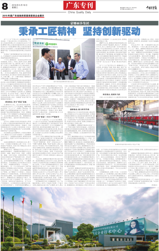 会上,副省长袁宝成宣读省政府关于表彰2015年度广东省政府质量奖获奖企业的通报。广东省政府质量奖从2009年开始,每两年评选出广东省内不超过 10家企业作为先进典型,并奖励100万元。作为广东省政府设立的质量奖项,经企业申报,质量奖评审组现场审查与考核,最后经广东省政府研究决定:授予包括蒙娜丽莎集团股份有限公司在内的9家企业“2015年度广东省政府质量奖”。