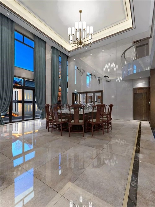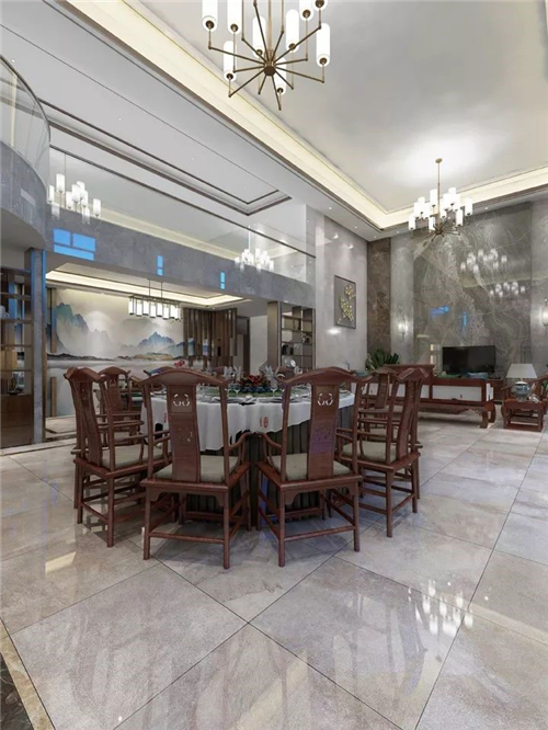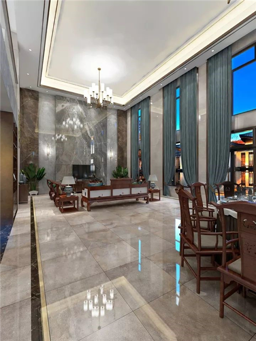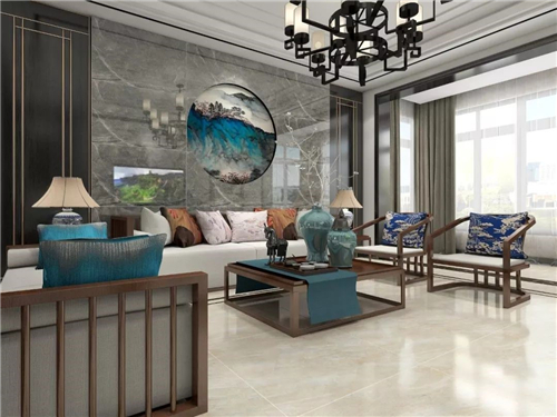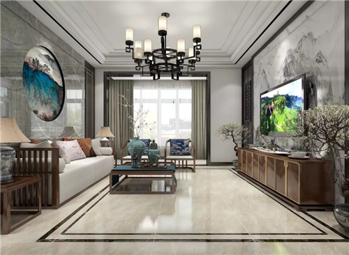 客厅是王先生最满意的地方,崇尚原木自然的中式元素由主要由实木家具来承担。而“新”的部分则交给墙面和地面来表达,选用了蒙娜丽莎天韵石系列,深灰色的大理石瓷砖让空间格调更大气优雅,与地面的浅色相接,层次分明。