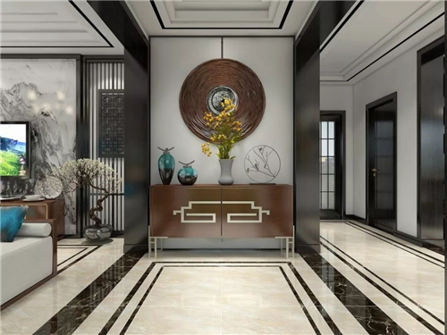 朱先生偏爱传统中式家居里红木+大理石的搭配,因此在蒙娜丽莎的瓷砖中挑选了同色系的陶瓷大板,为电视背景墙拼接出深浅有致的层次感,地面拼花也凸显高贵延伸之感。