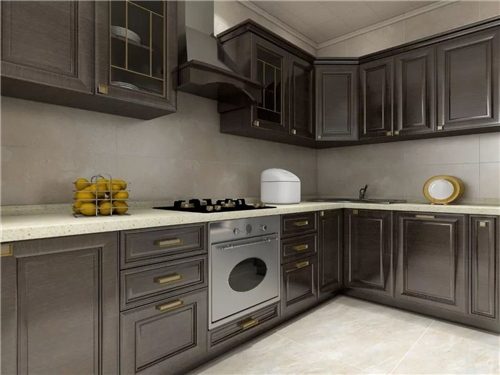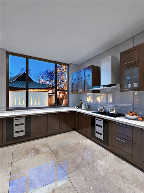 厨房用沉稳大气胡桃木色搭配料理台上铺贴的素色大理石,质感十足,让做饭也拥有了特别的仪式感。