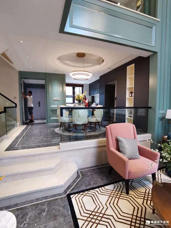 项目位于贵州铜仁,是一套接近600㎡的别墅,整个设计方案均采用蒙娜丽莎瓷砖,从色彩到细节,满足设计师想要达到的设计效果。