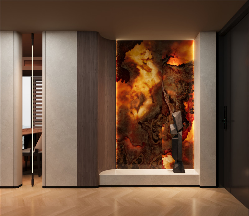 将琥珀的层叠肌理与玉石的温润透光相融合,在砖面创造出深邃而灵动的视觉纵深。随着光线流转,砖体色泽由暖琥珀渐渐过渡为浅金,光影在层理间如琉璃般交织叠映,既保留了天然石材的生命脉络,又为空间镀上一层静谧而流动的光之诗。