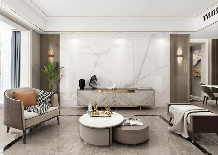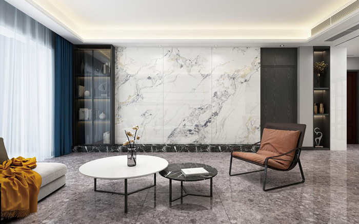 背景墙作为空间的点睛之缀,瓷砖规格越大,所容纳的内容就越多,砖面上可以承载更多的纹理元素,整体视野就更加广阔,就像是影院IMAX的超大银幕让特效大片更震撼,陶瓷大板单片面积大,基本不用再做造型和切割,就能让客厅背景墙拥有广大视野,获得视觉上的聚焦。