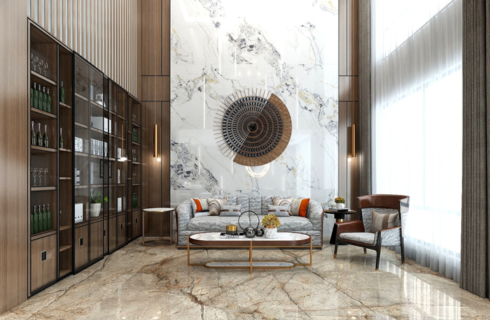 一面背景墙,是提升家居颜值最好的选择,也是为家庭“添彩头”最为重要的一环。受中国传统观念影响,无论是家居客厅或是酒店工程墙面,背景墙面往往都会被赋予美好的风水寓意:山高流水,连绵画卷,寓意着财源不断、富贵吉祥;浩天碧水、云雾缭绕,寓意着品行高洁、祥云常伴……基于不同风水寓意的画面需要,连纹陶瓷大板凭借其可定制的特性,常被应用于客厅背景墙、玄关、酒店、工程墙面等区域。